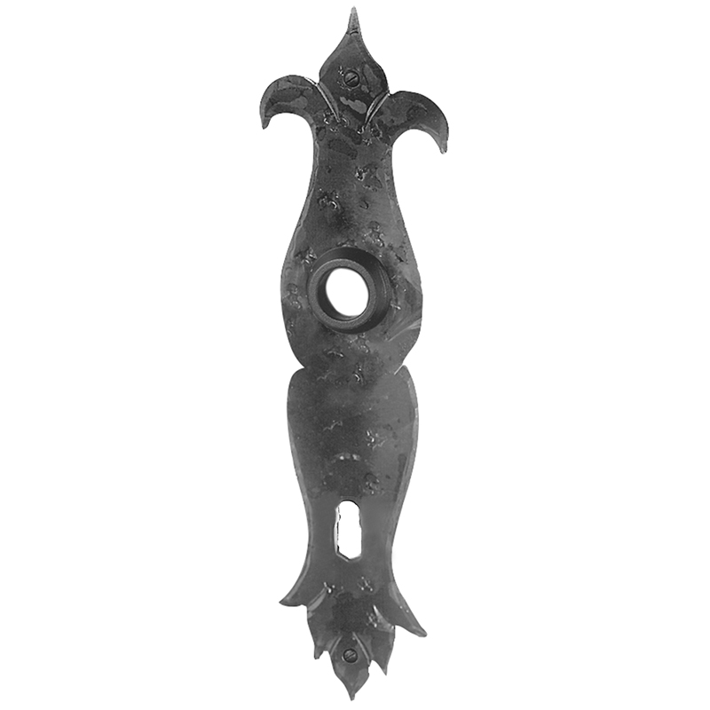 Schmiedeisen naturblank matt lackiert, Drückerführung 18 mm, oberes Schraubenloch bis Mitte Drückerführung 70 mm, mit Schrauben