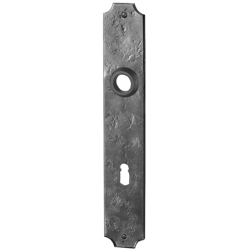 Schmiedeisen naturblank matt lackiert, Drückerführung 18 mm, oberes Schraubenloch bis Mitte Drückerführung 61 mm, mit Schrauben