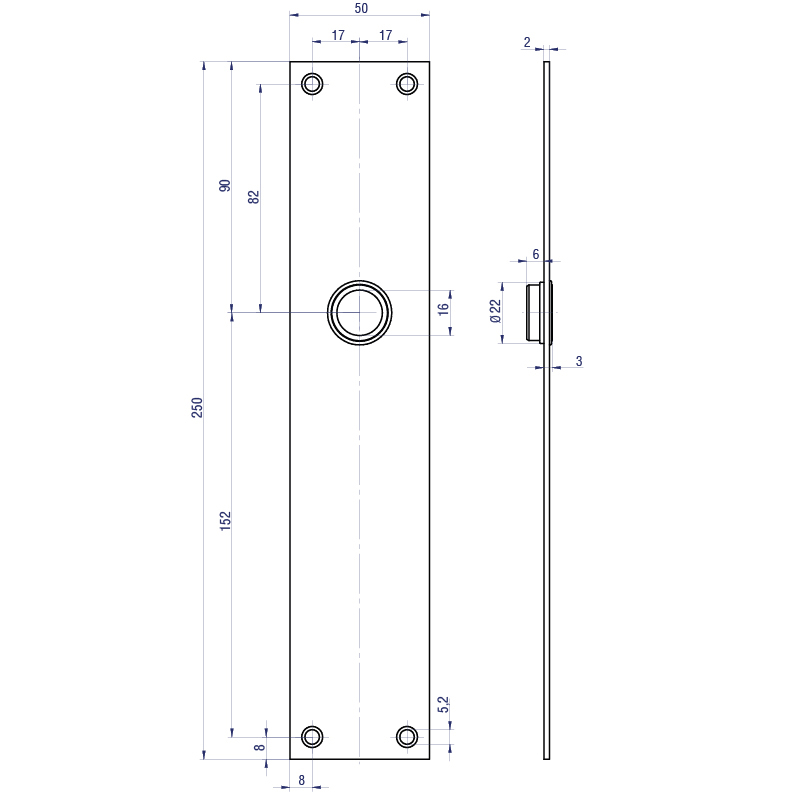 Messing geschliffen matt vernickelt, Drückerführung 16 mm, Drückerlagerung einwärts, Schilddicke mit Führung 9 mm, oberes Schraubenloch bis Mitte Drückerführung 82 mm