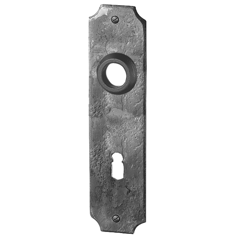 Eisen naturblank (geringe Korrosionsbeständigkeit), Distanz Drückerloch - oberes Schraubenloch 40 mm, Schrauben im Lieferumfang enthalten