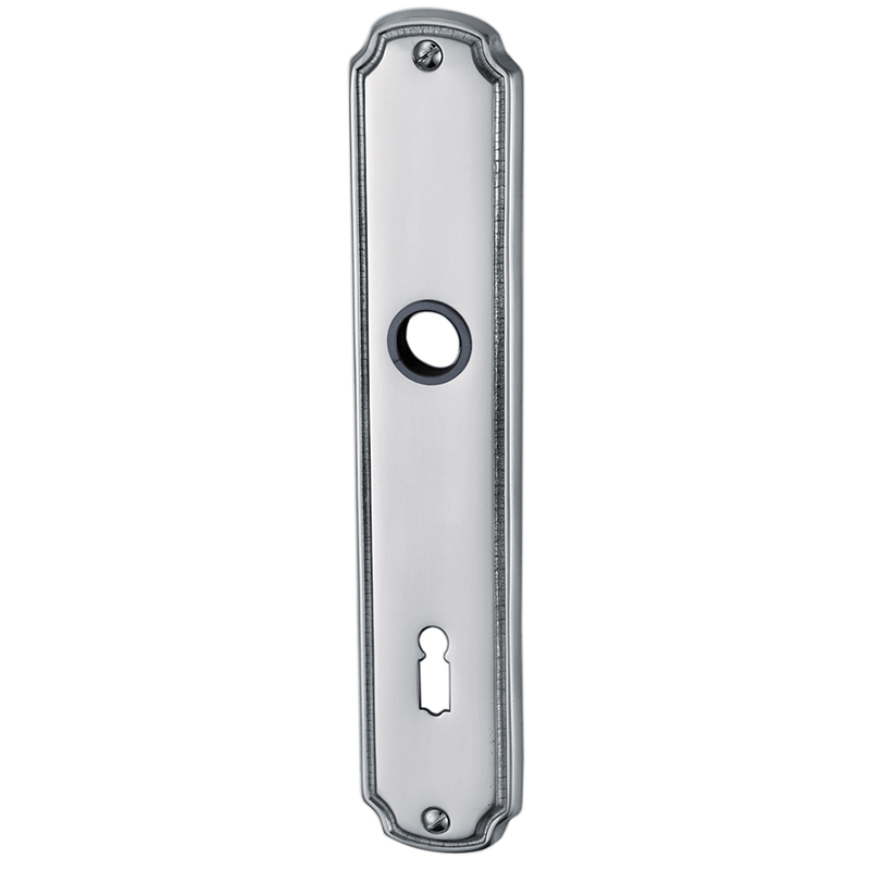 Messing poliert verchromt, Drückerführung 16 mm, oberes Schraubenloch bis Mitte Drückerführung 69 mm, mit Schrauben