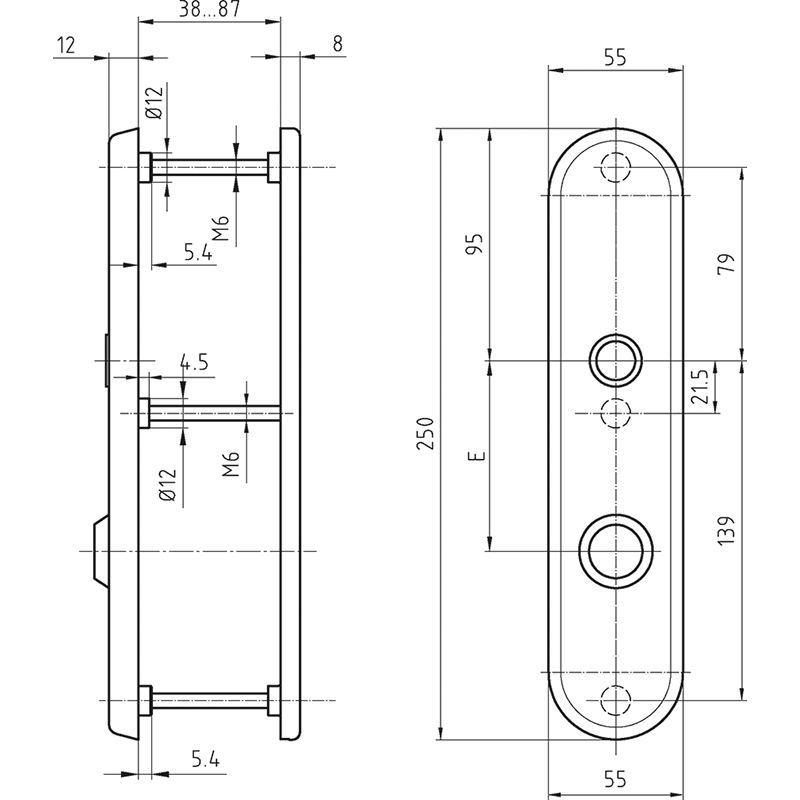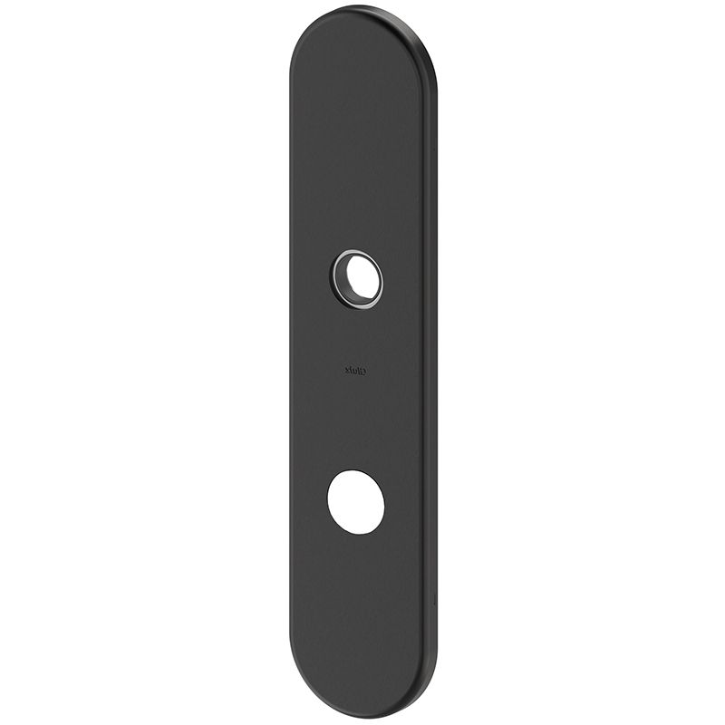Clip-Abdeckung Edelstahl matt, PVD schwarz beschichtet, Grundplatte Stahl verzinkt mit 3 Schraubenlöcher M6, Drückerführung bündig, Führung 16 mm für Drücker mit Hals-Ø 20 mm, Mitte oberes Schraubenloch bis Mitte Drückerführung 79 mm,