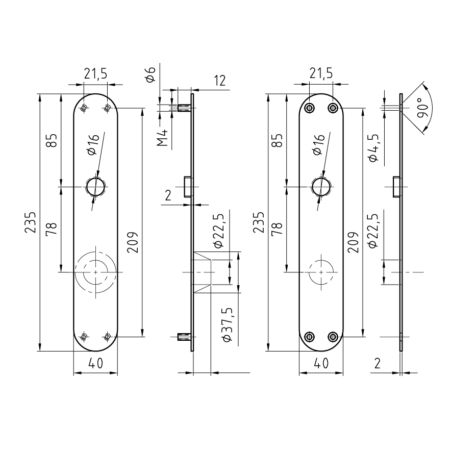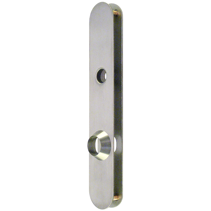 Edelstahl matt, Führung 16 mm einwärts, Aussenschild mit 4 Gewindenocken M4 x 12 mm für paarweise Verschraubung mit Innenschild, Mitte oberes Schraubenloch bis Mitte Drückerführung 72 mm, ohne Schrauben