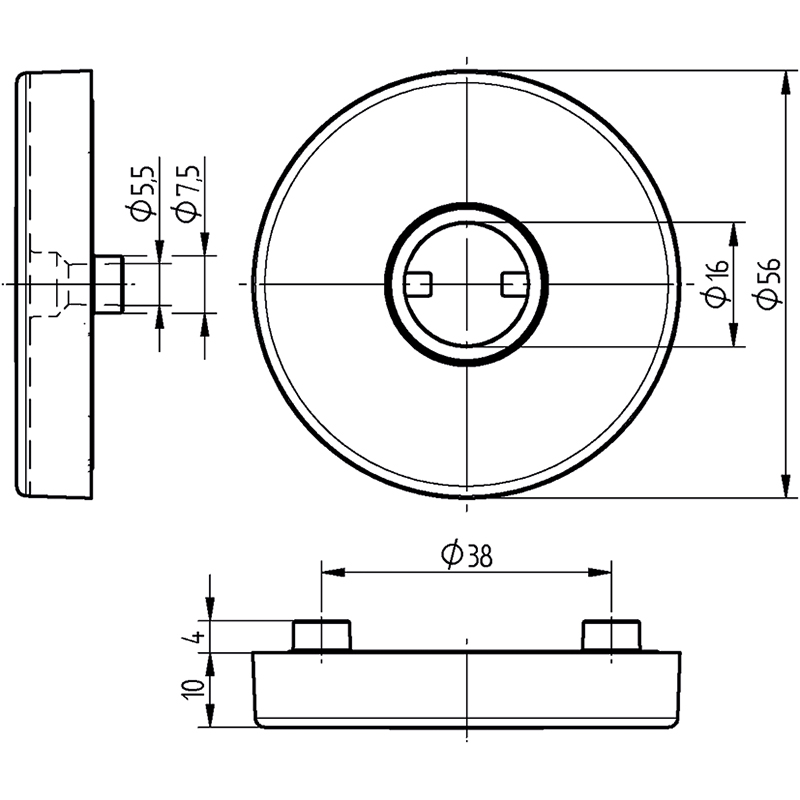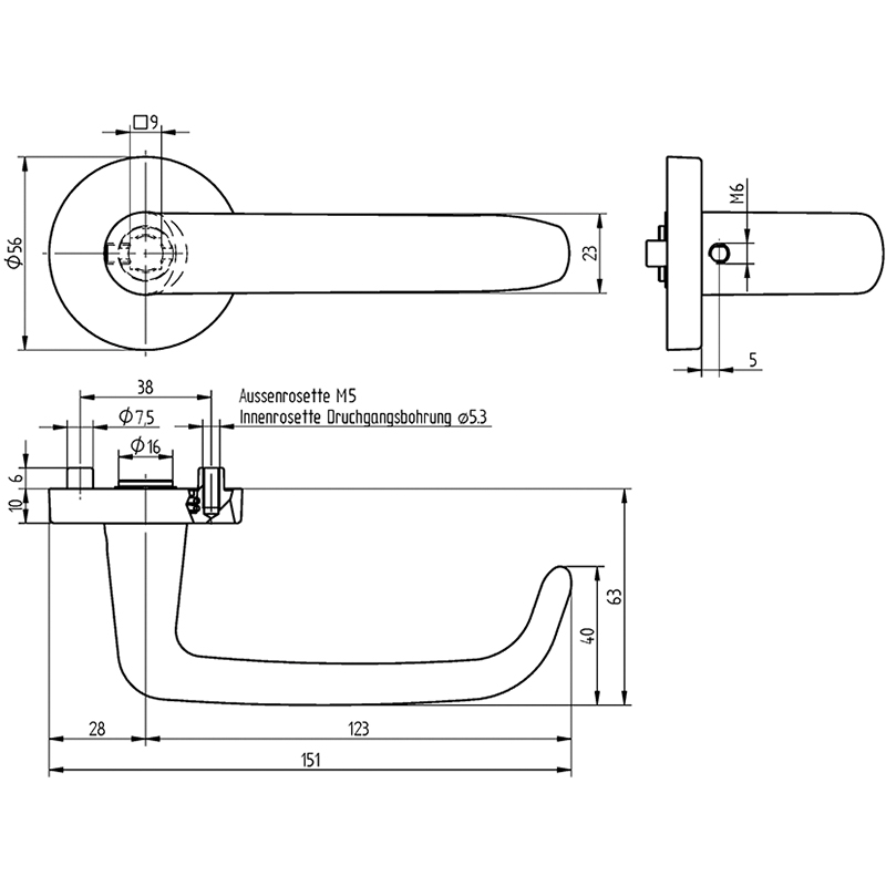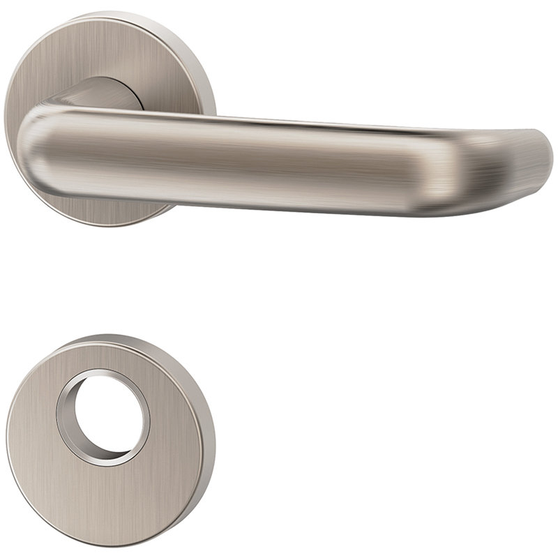 Drücker-Lochteil Messing matt vernickelt, auf Drückerrosette, Aussengriff fest auf Rosette, Innengriff mit Bajonettverschluss, mit Rückholfeder, Vierkantloch 9 mm, Innenrosette mit Führungsnocken Ø 7,5 mm, Aussenrosette mit Gewindenocken Ø 7,5 mm / M5, geprüft nach EN 179, geprüft nach EN 1906, ohne Schrauben