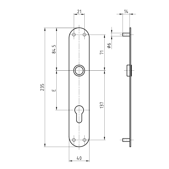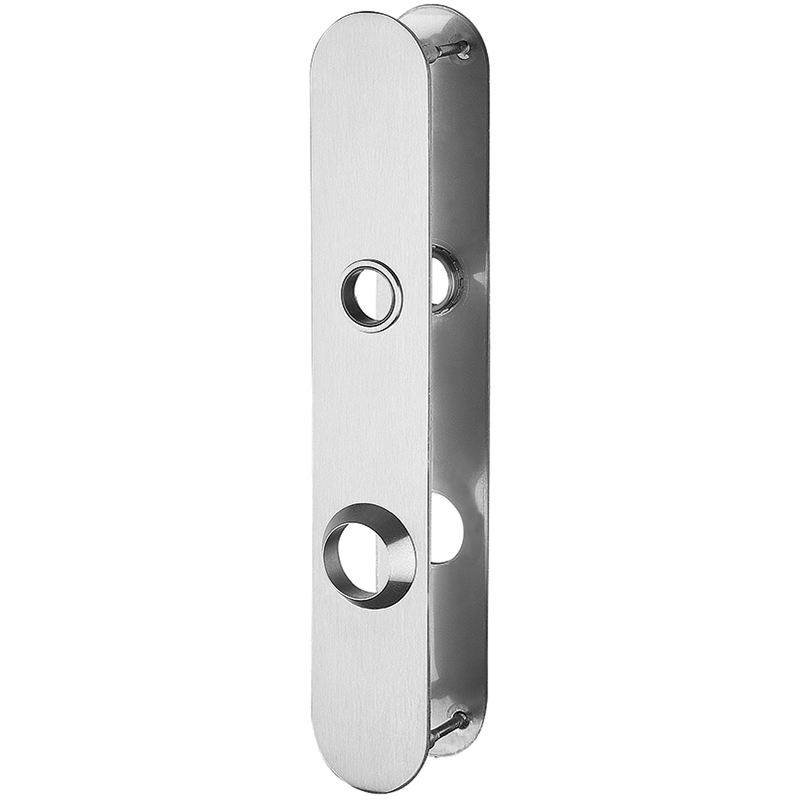 Edelstahl matt, mit Führung 16 mm oder mit Oval-Stanzung für Knopffestmontage, Aussenschild mit 4 Gewindenocken M4 x 14 mm für paarweise Verschraubung mit Innenschild glide easyfix, Mitte oberes Schraubenloch bis Mitte Drückerführung 71 mm, ohne Schrauben