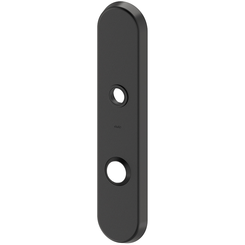Edelstahl matt, PVD schwarz beschichtet, mit Führung 16 mm, Drückerführung bündig, mit gehärteter Bohrschutzplatte und Gewindenocken M6 x 5,4 mm für paarweise Verschraubung mit Innenschild, Mitte oberes Schraubenloch bis Mitte Drückerführung 79 mm, ES 1 nach DIN 18257, RC 2 nach EN 1627