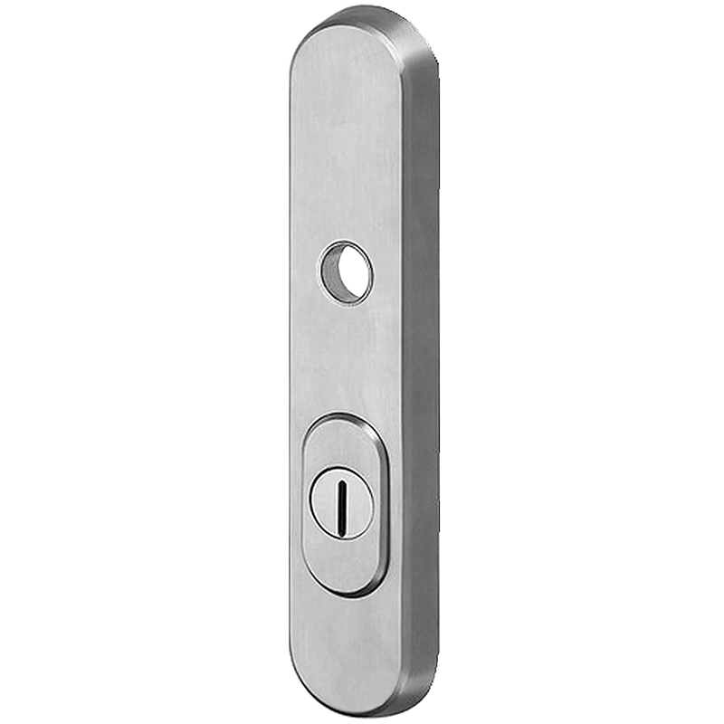 Edelstahl massiv matt, mit Führung 16 mm für Drücker mit Hals-Ø 20 mm oder mit Oval-Stanzung für Knopffestmontage, mit 2 Gewindenocken M8 x 30 mm und 1 Gewindenocken M6 x 6 mm für paarweise Verschraubung mit Innenschild, Mitte oberes Schraubenloch bis Mitte Drückerführung 79 mm, ohne Zylinderpanzerung, ohne Schraubenset