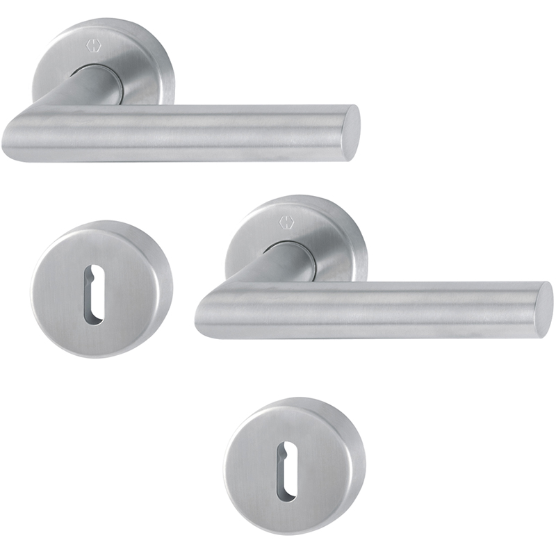 Edelstahl matt, geprüft nach DIN 1827, Verbindung: HOPPE-Profilvollstift (Loch- / Lochteil), Bund: für Lagerung fest / drehbar, HOPPE-Steckgriff-Verbindung mit Kugel-Arretierung Sertos®