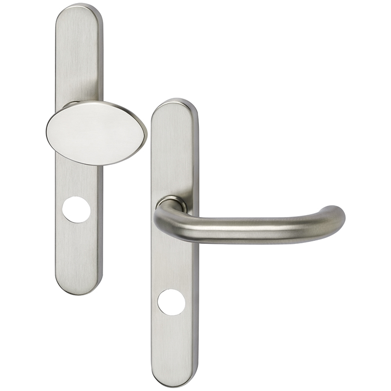 Edelstahl matt, Lochteil innen drehbarfest auf Langschild montiert, Innenschild mit Drücker-Rückholfeder und 3 Schraubenlöcher, Aussenschild mit ovalem Knopf 75 x 51 mm, Ausladung 45 mm und 3 Gewindenocken M6 für paarweise Montage, mit losem Wechselschlossstift M12 und 3 Schrauben SK M6 x 80 mm