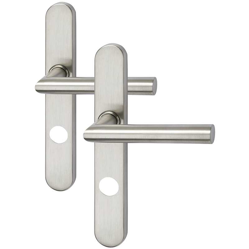 Edelstahl matt, Lochteil drehbar fest auf Langschild montiert, Innenschild mit Drücker-Rückholfeder und 3 Schraubenlöcher, Aussenschild mit 3 Gewindenocken M6 für paarweise Montage, mit 3 Schrauben SK Ø M6 x 80 mm und Vierkantstift 8 x 130 mm