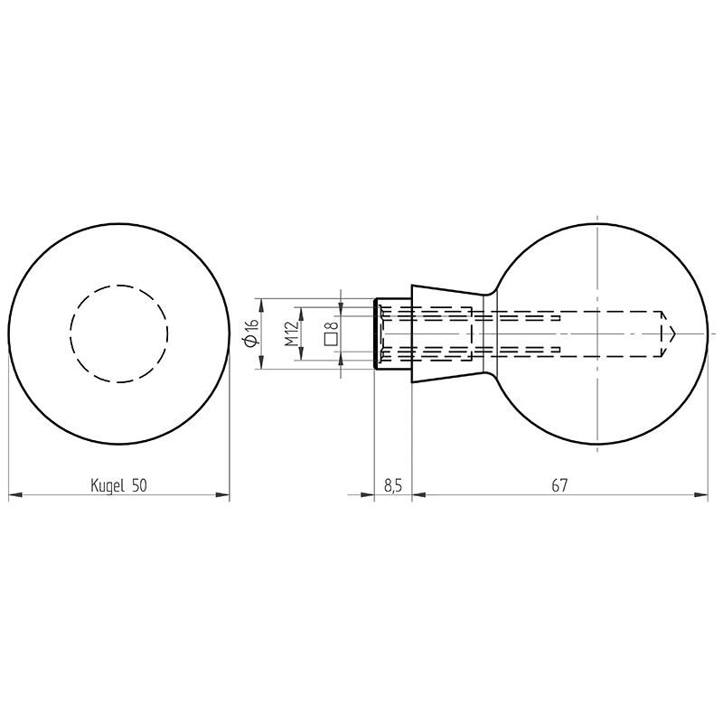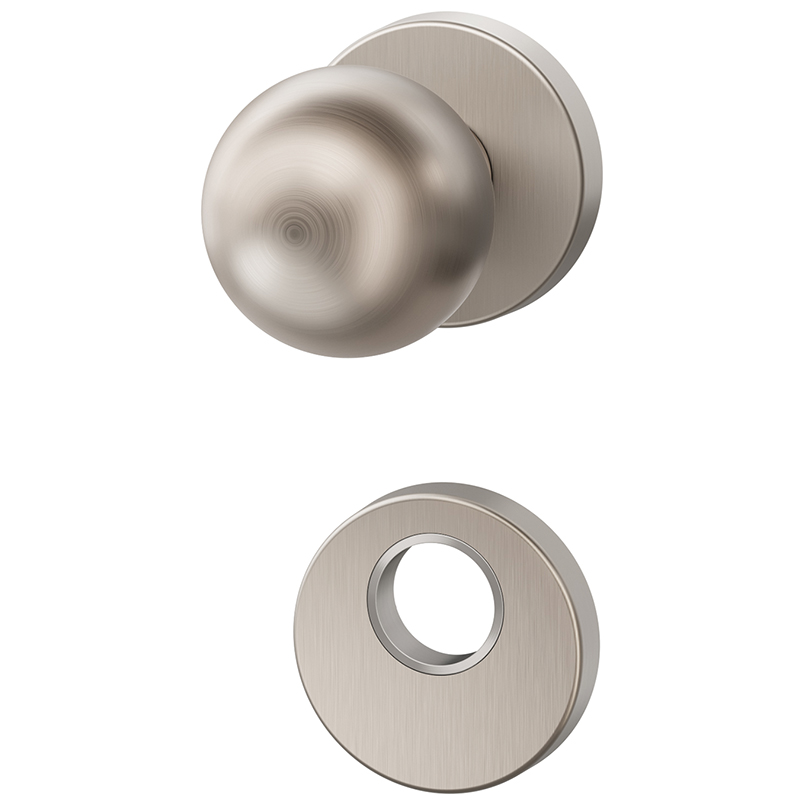 Zink oder Messing matt vernickelt, fest montiert auf Drückerrosette, Vierkantloch 9 mm / M12, Aussenrosette mit Gewindenocken Ø 7,5 mm / M5, geprüft nach EN 1906, ohne Schrauben