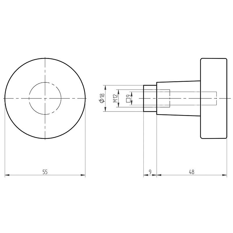 Zink matt vernickelt, fest montiert auf Drückerrosette, Vierkantloch 9 mm / M12, Aussenrosette mit Gewindenocken Ø 7,5 mm / M5, geprüft nach EN 1906, ohne Schrauben