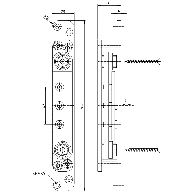 Unterkonstruktion Stahl, Abdeckwinkel Edelstahl gebürstet, komplett montiert, integrierte Ausreisssicherung, Verstellbereich 3 mm, massive Frontplatte, integrierte Höhenverstellung zur Ein-Mann-Justierung des Türelements, mit Bandaufnahme 48 mm, Tragkraft bei 2 Band ca. 150 Kilo