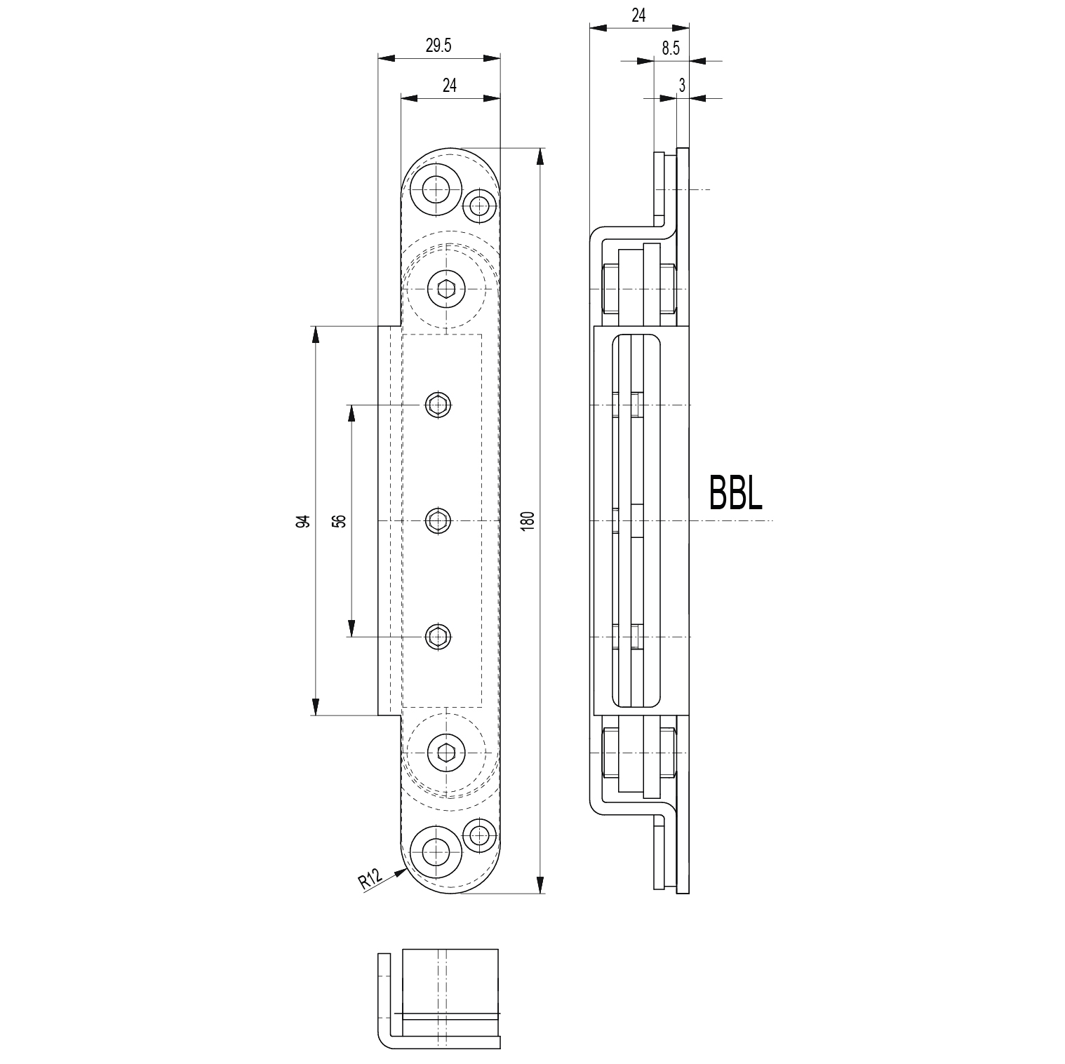 Unterkonstruktion Stahl, Abdeckwinkel Edelstahl gebürstet, komplett montiert, integrierte Ausreisssicherung, Verstellbereich 3 mm, massive Frontplatte, Tragkraft bei 2 Band ca. 150 Kilo