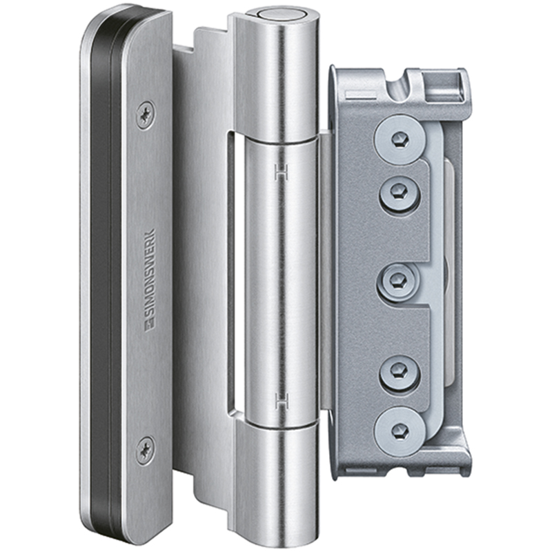 Stahl oder Edelstahl matt, für Holztüren mit Überschlag 15 mm und 18 mm, für Haustüren mit Flügeldichtung und mit Stiftsicherung für auswärts öffnende Türen, für Falzluft 4 mm, mit wartungsfreier Gleitlagertechnik und Komfort-Verstellung, Höhen-, Seiten- und Andruckverstellung ± 3 mm, alle Verstellmöglichkeiten einstellbar auch ohne Aushängen oder Unterkeilen der Türe, mit verdeckt liegendem Aufnahmeelement im Flügel und Rahmen, minimaler Fräsaufwand, Belastbarkeit 160 Kilo