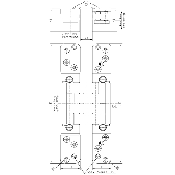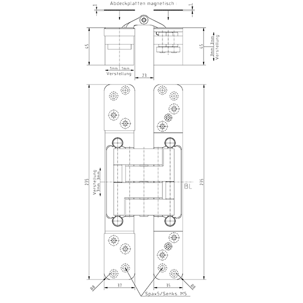 Gehäuse Aluminium, Lappen Stahl, für stumpf einschlagende Türen, bei geschlossener Tür ist das Band unsichtbar, 3-dimensionale Verstellung, wartungsfreie Lagerungen, durch grosse Auslenkung für Aufdoppelungen geeignet, mit sichtbaren Schrauben oder Design, zur Verwendung an Türen in Flucht- und Rettungswegen mit Anforderungen an den Rauch- und Brandschutz, ohne Schrauben, Tragkraft bei 2 Band ca. 150 Kilo