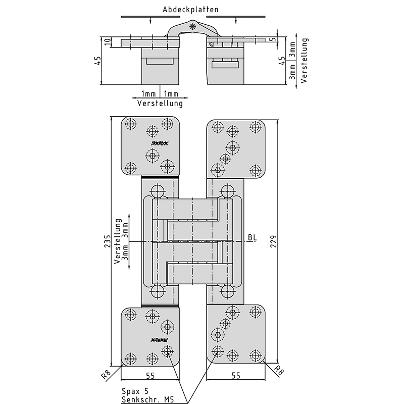 Gehäuse Stahl, Lappen Stahl, mit Sonderfrontplatten, für stumpf einschlagende Türen, bei geschlossener Tür ist das Band unsichtbar, 3-dimensionale Verstellung, wartungsfreie Lagerungen, durch grosse Auslenkung für Aufdoppelungen geeignet, mit sichtbaren Schrauben oder Design, zur Verwendung an Türen in Flucht- und Rettungswegen mit Anforderungen an den Rauch- und Brandschutz, ohne Schrauben, Tragkraft bei 2 Band ca. 200 Kilo