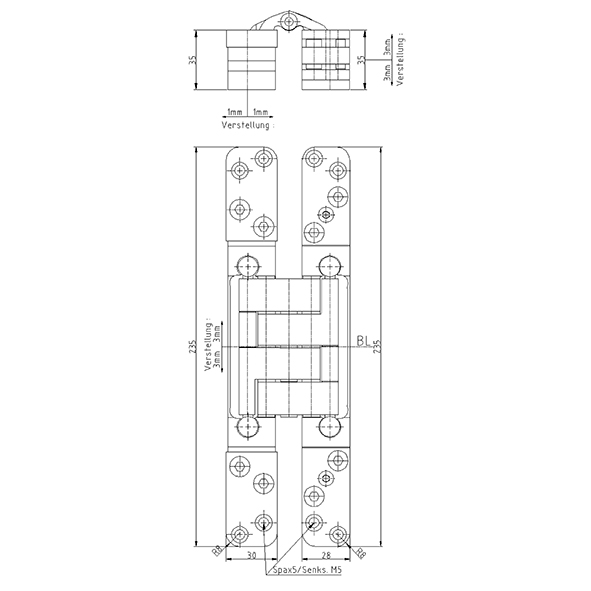 Gehäuse Stahl, Lappen Stahl, für stumpf einschlagende Türen, bei geschlossener Tür ist das Band unsichtbar, 3-dimensionale Verstellung, wartungsfreie Lagerungen, zur Verwendung an Türen in Flucht- und Rettungswegen mit Anforderungen an den Rauch- und Brandschutz, ohne Schrauben, Tragkraft bei 2 Band ca. 200 Kilo