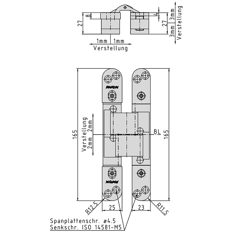 Gehäuse Aluminium, Lappen Stahl, für stumpf einschlagende Türen, bei geschlossener Tür ist das Band unsichtbar, 3-dimensionale Verstellung, wartungsfreie Lagerungen, mit Befestigungsschrauben, Tragkraft bei 2 Band ca. 40 Kilo