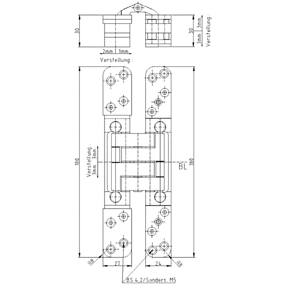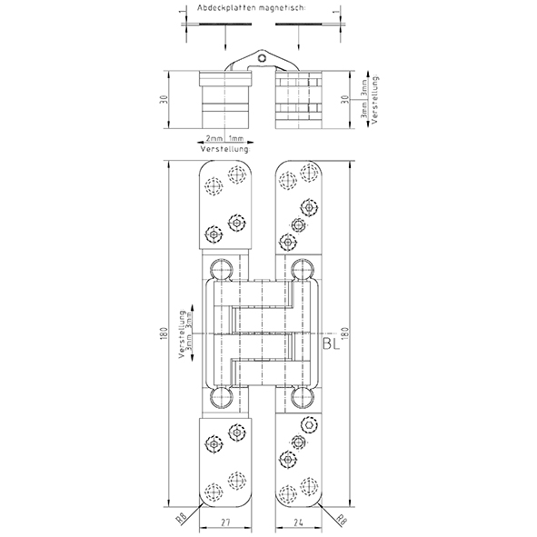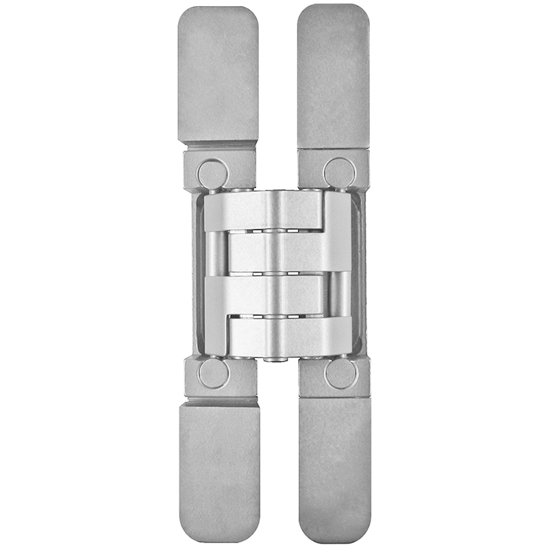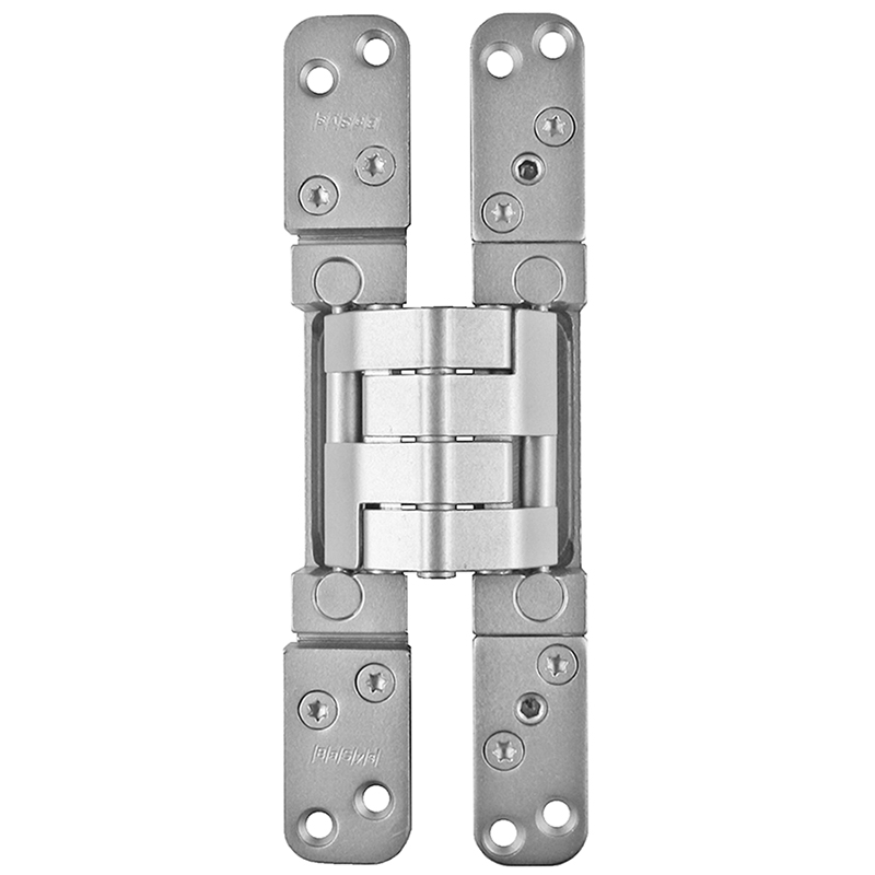 Gehäuse Aluminium, Lappen Stahl, für stumpf einschlagende Türen, bei geschlossener Tür ist das Band unsichtbar, 3-dimensionale Verstellung, wartungsfreie Lagerungen, mit sichtbaren Schrauben oder Design-Ausführung, zur Verwendung an Türen in Flucht- und Rettungswegen mit Anforderungen an den Rauch- und Brandschutz, mit Befestigungsschrauben, Tragkraft bei 2 Band ca. 100 Kilo,