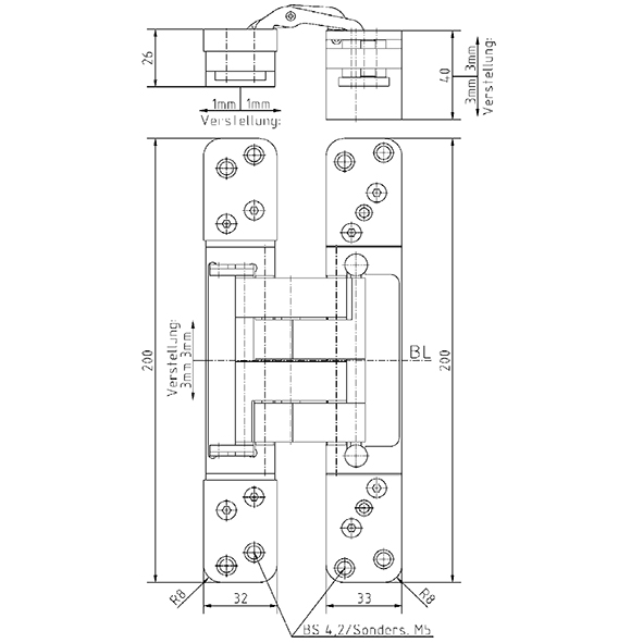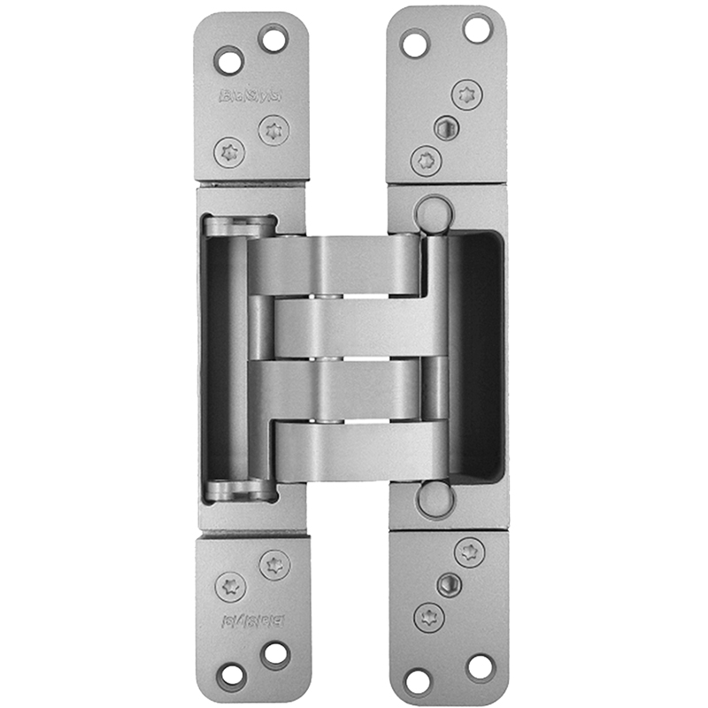 Gehäuse Aluminium, Lappen Stahl, für stumpf einschlagende Türen mit versetztem Zargenspiegel, bei geschlossener Tür ist das Band unsichtbar, 3-dimensionale Verstellung, wartungsfreie Lagerungen, mit Befestigungsschrauben