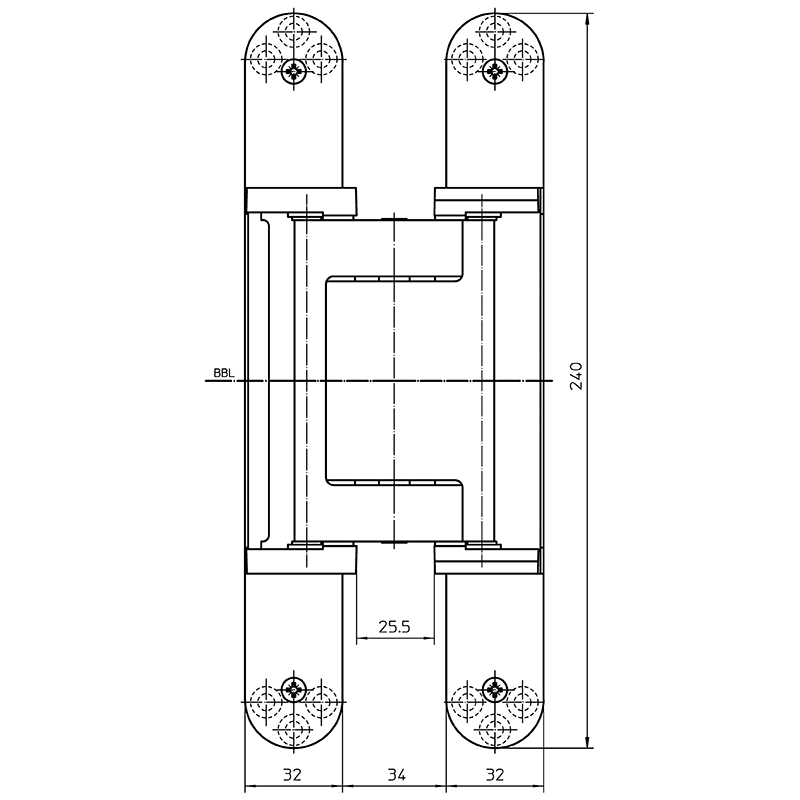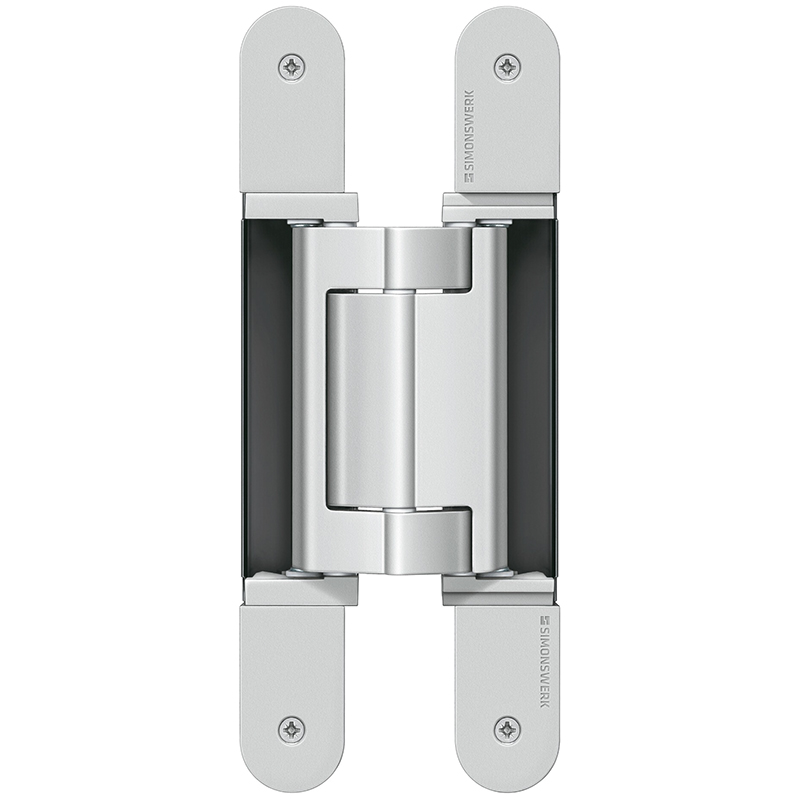 Grundmaterial bestehend aus Zinkdruckguss, Aluminium und Stahl, für Türen mit Aufdoppelungen bis 8 mm komplett verdeckt liegend, für ungefälzte Türen an Holz- und Stahlzargen, 3-dimensionale Verstellmöglichkeit, Seiten- und höhenverstellung ±3 mm, Andruck ±1 mm, mit identischen Flügel- und Rahmenlappenbreiten, wartungsfreie Gleitlagertechnik, Öffnungswinkel bis 180°, Tragkraft bei 2 Band ca. 160 Kilo