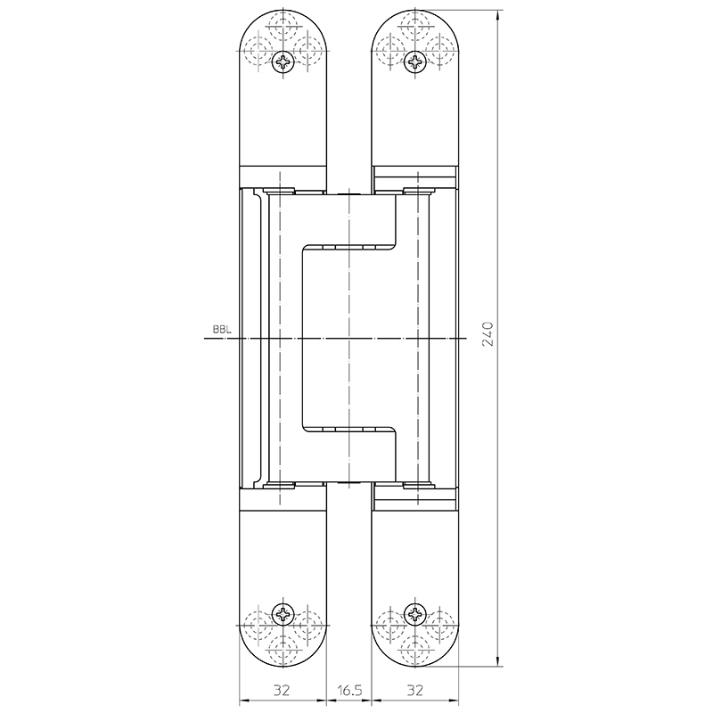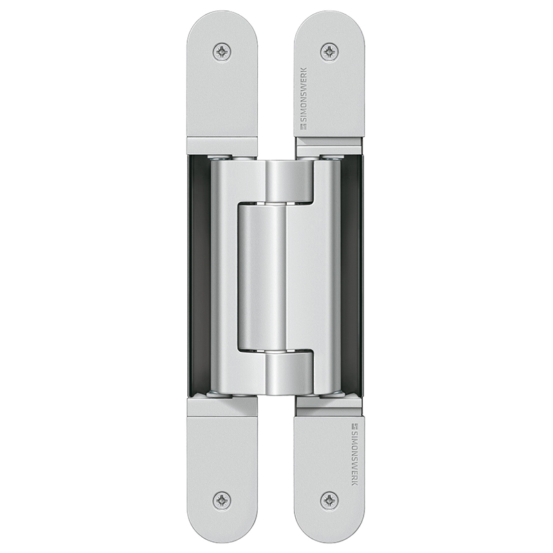 Grundmaterial bestehend aus Zinkdruckguss, Aluminium und Stahl, komplett verdeckt liegend, für ungefälzte Türen an Holz- und Stahlzargen, 3-dimensionale Verstellmöglichkeit, Seiten- und Höhenverstellung ±3 mm, Andruck ±1 mm, wartungsfreie Gleitlagertechnik, Öffnungswinkel bis 180°, Tragkraft bei 2 Band ca. 200 Kilo