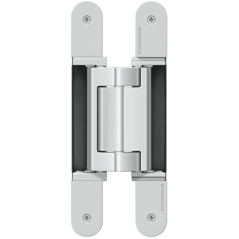 für Brandschutztüren, mit integriertem Brandschutzbildner, komplett verdeckt liegend, für ungefälzte Türen an Holz- und Stahlzargen, 3-dimensionale Verstellmöglichkeit, Seiten- und Höhenverstellung ±3 mm, Andruck ±1 mm, mit identischen Flügel- und Rahmenlappenbreiten, wartungsfreie Gleitlagertechnik, Öffnungswinkel bis 180°, Tragkraft bei 2 Band ca. 160 Kilo
