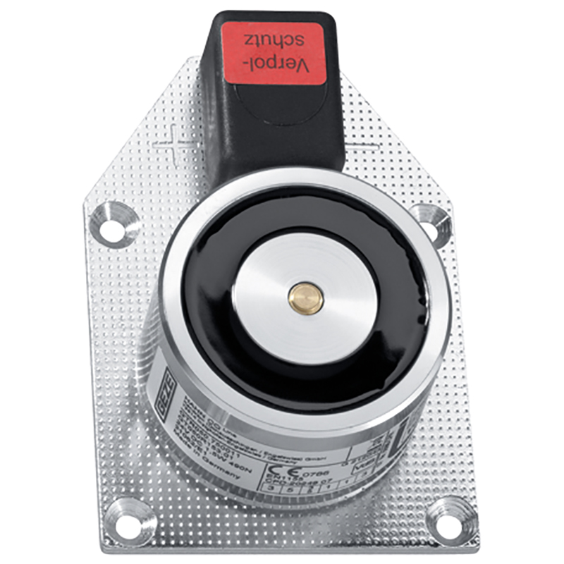 Magnetspule verzinkt, für Wandmontage mit Grundplatte, zum Feststellen von Brand- und Rauchschutztüren in Kombination mit Türschliessern, Betriebsspannung 24 V DC, Haltekraft 490 N, ohne Zubehör