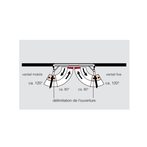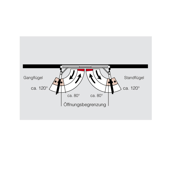 ohne Türschliesser, mit integrierter mechanischer Schliessfolgeregelung für 2-flüglige Türen, beim Schliessen der Tür bleibt der Gangflügel in Warteposition bis der Standflügel geschlossen ist und über die Schliessfolgeregelung den Gangflügel freigibt
