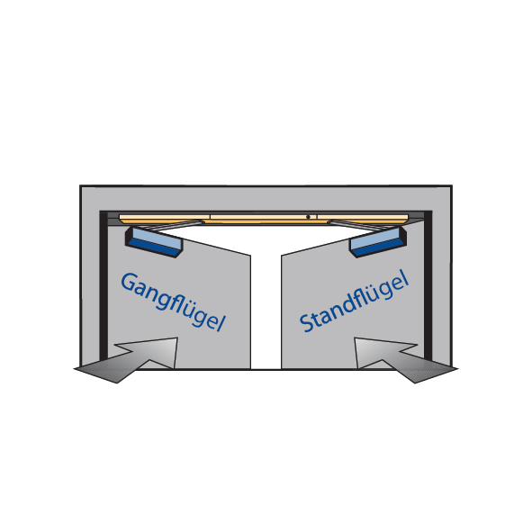 mit integrierter mechanischer Schliessfolgeregelung für 2-flüglige Türen und beidseitiger elektromechanischer Feststellung stufenlos von ca. 80° bis 130° einstellbar und integrierter Rauchschaltzentrale mit Verschmutzungs-anzeige, wird bei geöffneten Türen in der E-Feststellung eingerasteten Türflügeln die Tür geschlossen, bleibt der Gangflügel in seiner Warteposition, bis auch der Standflügel geschlossen ist und über die Schliessfolgeregelung den Gangflügel freigibt, Betriebsspannung 230 V AC, Türblattmontage auf Bandgegenseite