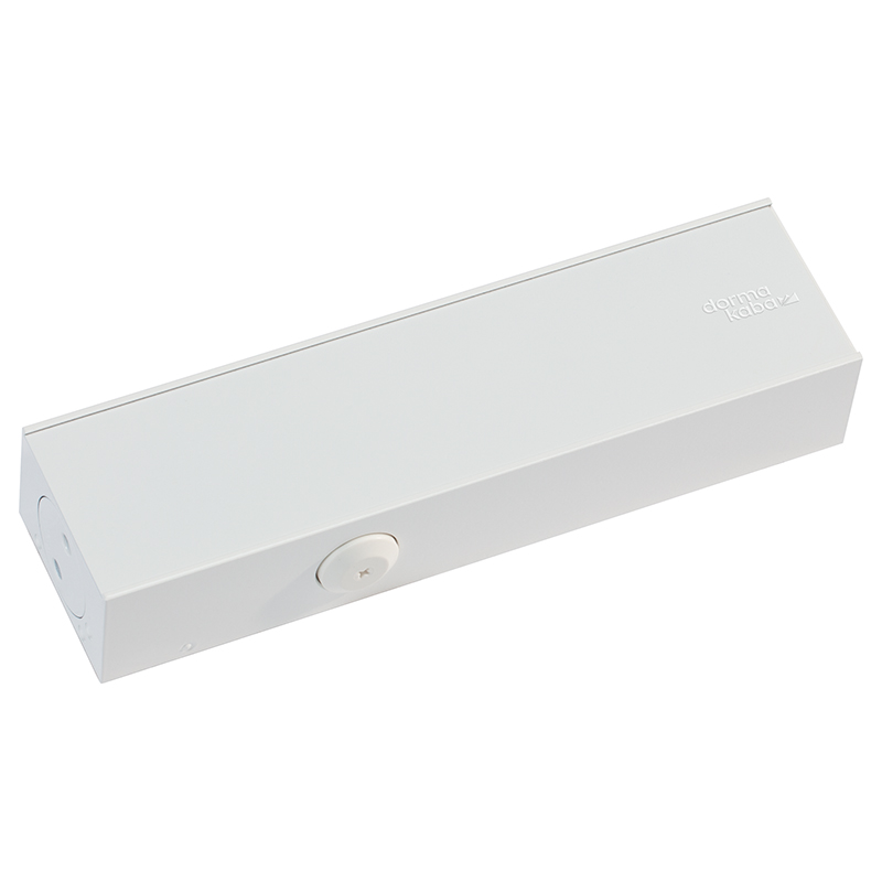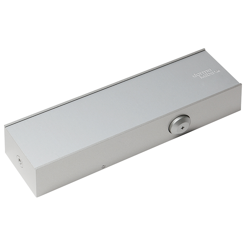 aufgesetzter Zahntrieb-Türschliesser mit stufenlos einstellbarer Schliess-kraft und Öffnungsdämpfung, Schliessgeschwindigkeit über zwei Ventile unabhängig voneinander stufenlos einstellbar, Endschlag über Gestänge einstellbar, für Türblattmontage auf Bandseite, sowie für Kopfmontage auf Bandgegenseite