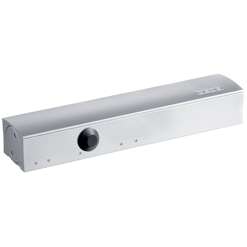aufgesetzter Zahntrieb-Türschliesser mit Öffnungsdämpfung, Schliesskraft, Öffnungsdämpfung und Schliessgeschwindigkeit von vorne einstellbar, Endschlag über Gestänge einstellbar, für Türblattmontage auf Bandseite, sowie für Kopfmontage auf Bandgegenseite