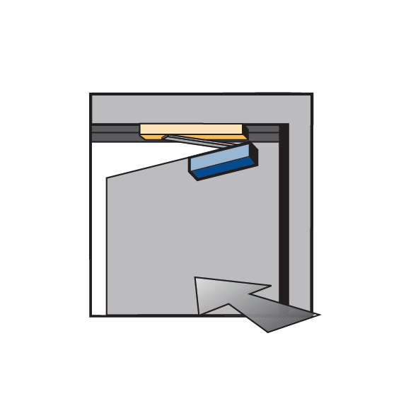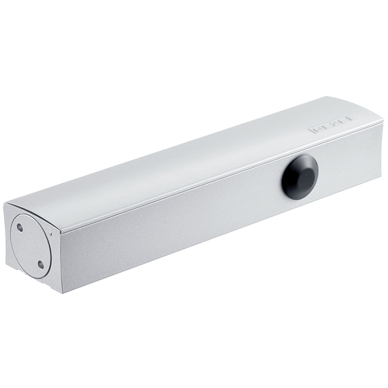 aufgesetzter Zahntrieb-Türschliesser mit Öffnungsdämpfung, Schliesskraft, Öffnungsdämpfung, Endschlag und Schliessgeschwindigkeit von vorne einstellbar, für Türblattmontage auf Bandgegenseite, sowie für Kopfmontage auf Bandseite
