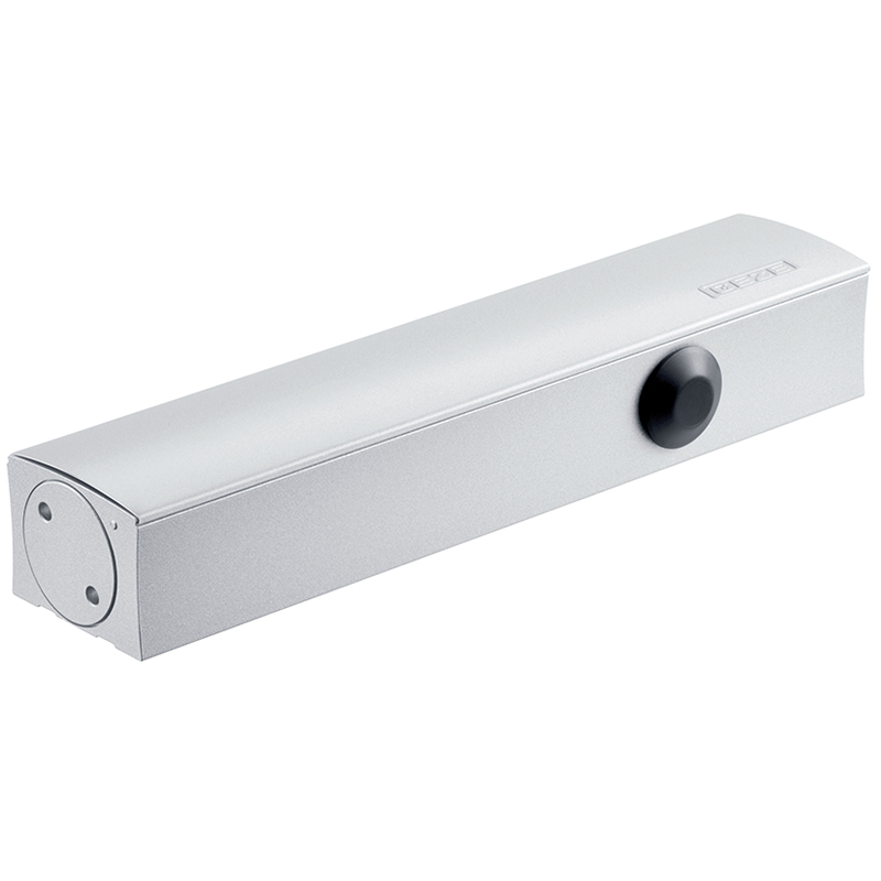 mit integrierter mechanischer Schliessfolgeregelung für 2-flüglige Türen und beidseitiger elektromechanischer Feststellung stufenlos von ca. 80° bis 130° einstellbar und integrierter Rauchschaltzentrale mit Verschmutzungs-anzeige, wird bei geöffneten Türen in der E-Feststellung eingerasteten Türflügeln die Tür geschlossen, bleibt der Gangflügel in seiner Warteposition, bis auch der Standflügel geschlossen ist und über die Schliessfolgeregelung den Gangflügel freigibt, Betriebsspannung 230 V AC, Türblattmontage auf Bandseite
