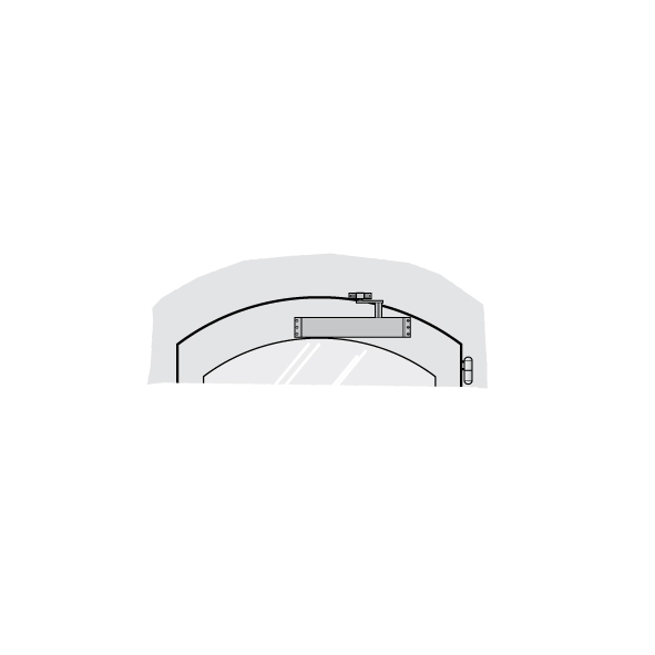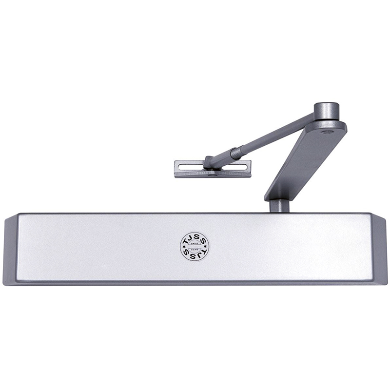 aufgesetzter Zahntrieb-Türschliesser, Aluminiumgehäuse mit Kunststoff-Abdeckung, stufenlos einstellbare Schliesskraft, Schliessgeschwindigkeit und Endschlag, mit Öffnungsdämpfung, alle Ventile beschriftet und von vorne einstellbar, ausziehbare Schwenkhebelachse kann bis 20 mm herausgezogen werden, für Türen mit hohem Überschlag, mit Montageanleitung, Bohrschablone und Befestigungsmaterial, für Türblattmontage auf Bandseite, sowie für Kopfmontage auf Bandgegenseite
