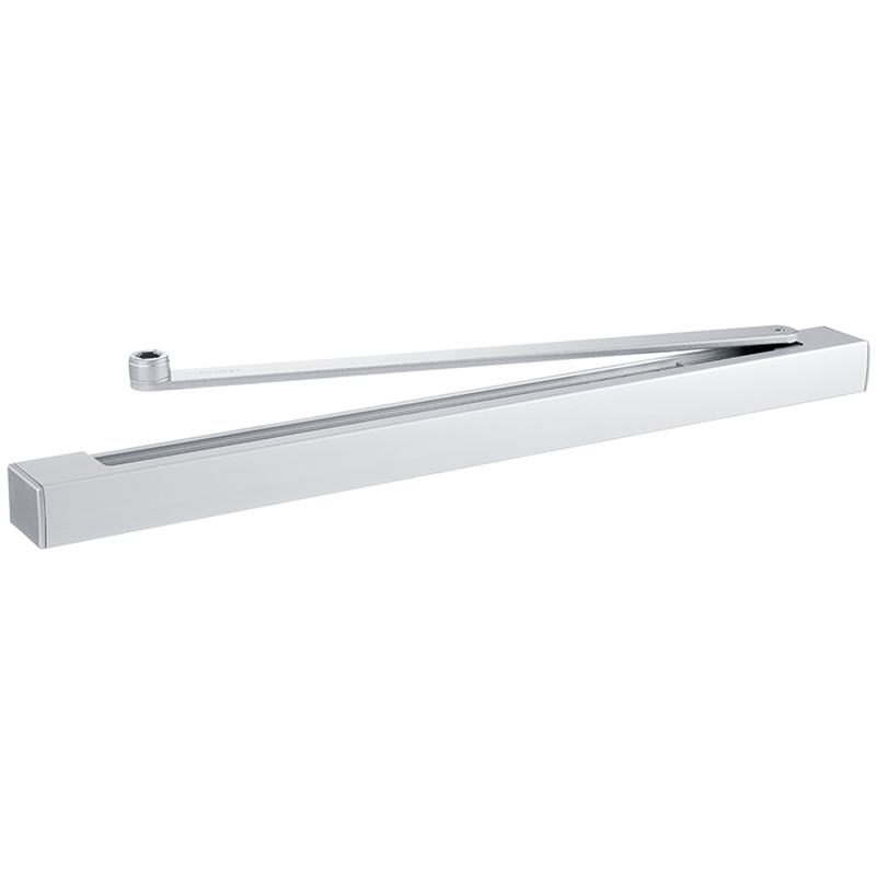 ferme-porte rapporté à bras avec amortissement d'ouverture et temporisation de fermeture, force de fermeture, amortissement d'ouverture, butée, vitesse de fermeture et temporisation de fermeture réglables par l'avant, à monter sur battant de porte côté fiche ainsi qu'en haut de la porte côté opposé à la fiche (en cas de montage en haut de la porte côté opposé à la fiche, la temporisation de fermeture est inactive)