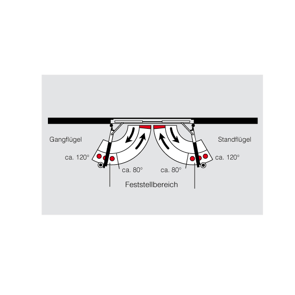 mit integrierter mechanischer Schliessfolgeregelung für 2-flüglige Türen und elektromechanischer Feststellung beider Flügel, Feststellpunkt zwischen 80° bis 120° einstellbar, der Gangflügel kann unabhängig vom Standflügel festgestellt werden, durch die werkzeuglos einstellbare Ausrückkraft kann die Feststellung auch von Hand problemlos ausgelöst werden, beim Schliessen der Tür bleibt der Gangflügel in Warteposition bis der Standflügel geschlossen ist und über die Schliessfolgeregelung den Gangflügel freigibt, Betriebsspannung 24 V DC