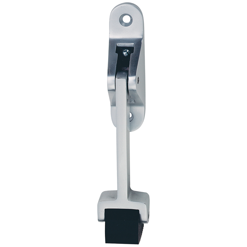 Aluminium silberfarbig einbrennlackiert, die Türe kann in jedem Öffnungswinkel festgestellt werden, der heruntergeklappte Hebel verhindert ein durch den Türschliesser bewirktes Zugehen der Türe, die Freigabe erfolgt durch einfaches Hochklappen des Feststellhebels, der dann durch eine Blattfeder gehalten wird, Mass zwischen Boden und Mitte unterem Schraubenloch muss 80 mm betragen