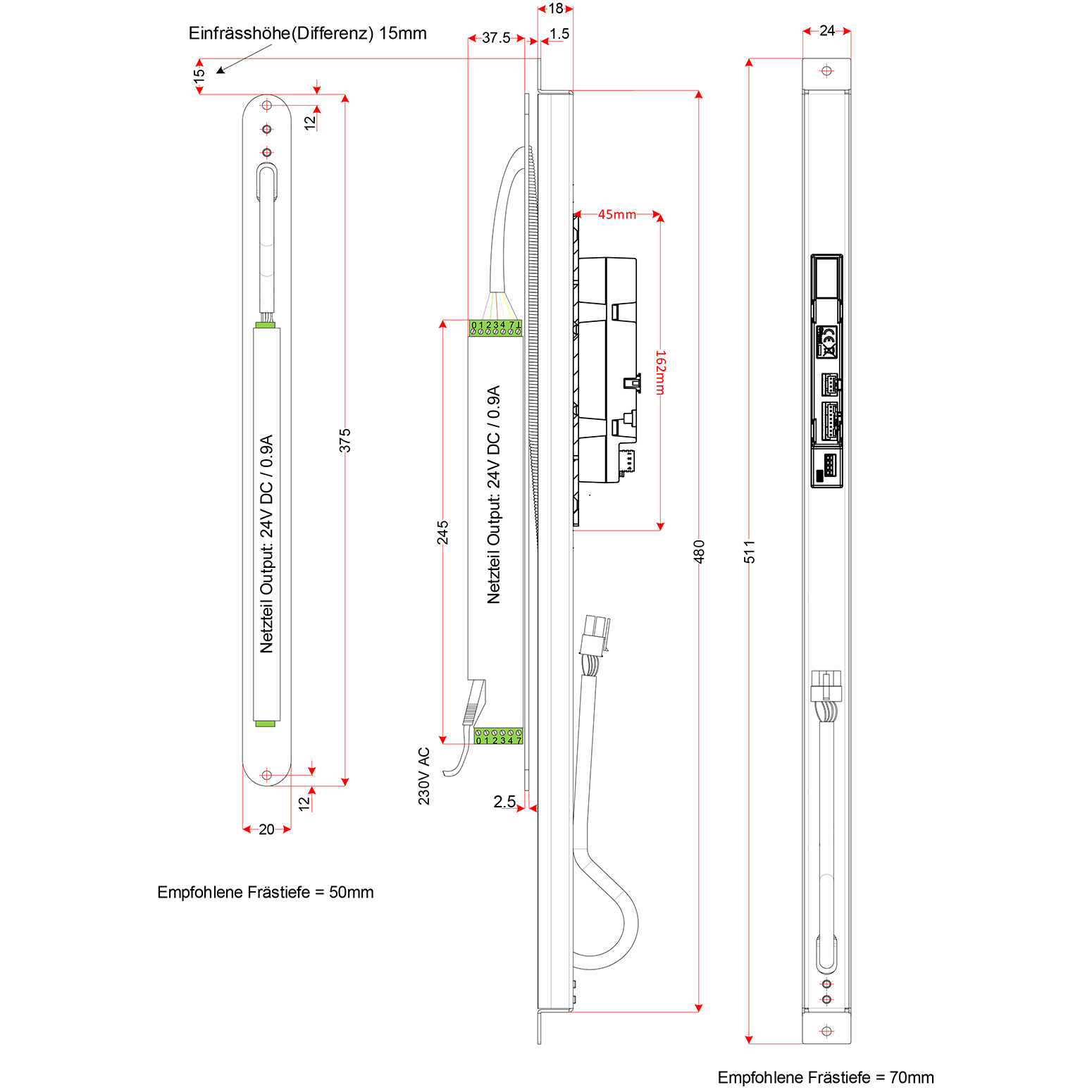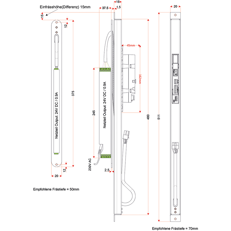 - 1 x Rahmenintegriertes Netzteil KFV, Flachstulp abgerundet 320 x 20 x 35 mm