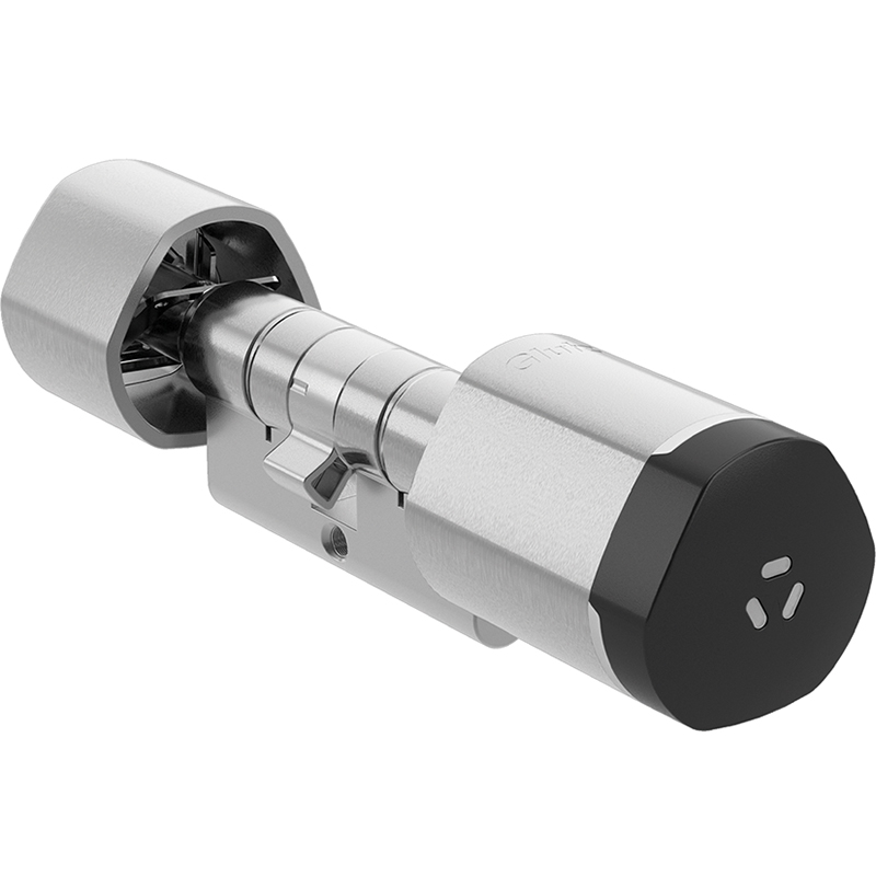Batteriebetriebener elektronischer Zylinder für Innen- und Aussentüren, Öffnen und Schliessen von aussen erfolgt durch das berührungslose Lesen des RFID-Mediums oder durch die Smartphone-App und anschliessendem Drehen des Knaufes, über den mechanischen Drehknopf auf der Innenseite ist eine Öffnung/Schliessung jederzeit gewährleistet