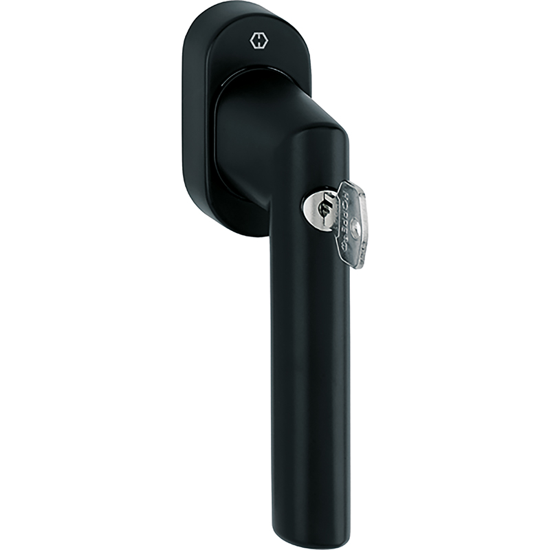 Acier inoxydable mat, avec technique de protection anti-effraction combinée jusqu'à 100 NM, avec cran à 90°, avec Secu100®, Secustik® et VarioFit®, fonction de blocage automatique en position fermée (0°) et en position basculée (180°), goupille pleine, variabilité de longueur de 10 mm, adaptation en continu par ressort de pression intégré dans le col de la poignée, testé selon DIN EN 13126-3 : 23/180-0131/13/C1, EN 1627-1630 RC1-6, et RAL-GZ 607/9, DIN EN 1627-1630 RC1-6, avec clé (fermeture H001) avec vis M5 x 45 et M5 x 50 mm