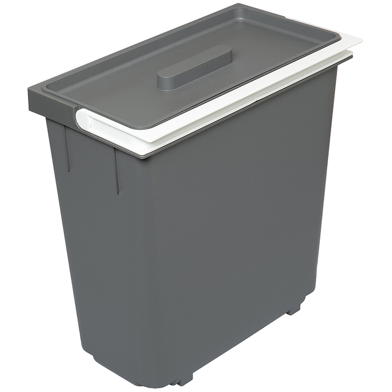 Plastique gris. Cette pièce de rechange est le récipient des modèles bas de la X-LINE de Müllex. Ce récipient de 15 litres avec couvercle assorti peut être utilisé pour collecter les matériaux à recycler et stocker les ustensiles de cuisine. Le conteneur s'intègre dans les ensembles X-LINE à partir d'une largeur de caisson de 600 mm. Récipient avec anse de support et couvercle.
