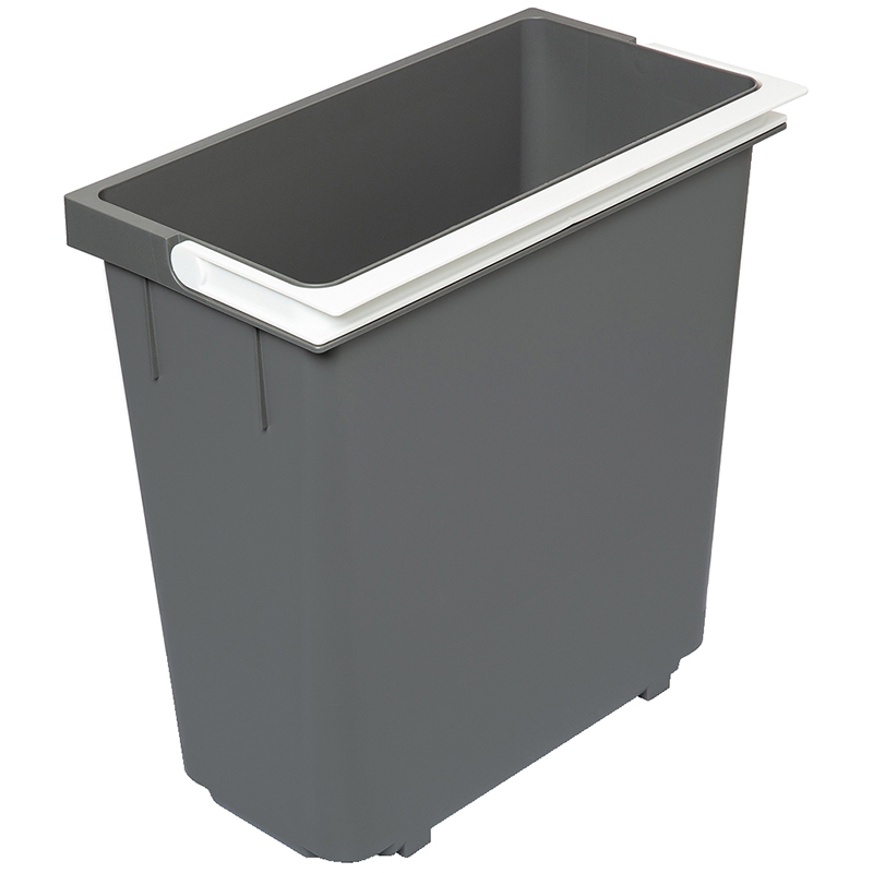 Plastique gris. Cette pièce de rechange est le récipient des modèles bas de la X-LINE de Müllex. Le récipient de 15 litres avec anse de support est fourni sans couvercle et s'intègre dans les ensembles collecteurs de déchets X-LINE pour les caissons à partir d'une largeur de 600 mm. Le récipient peut être utilisé pour la séparation, la collecte et le stockage de déchets à recycler et d'ustensiles de cuisine.