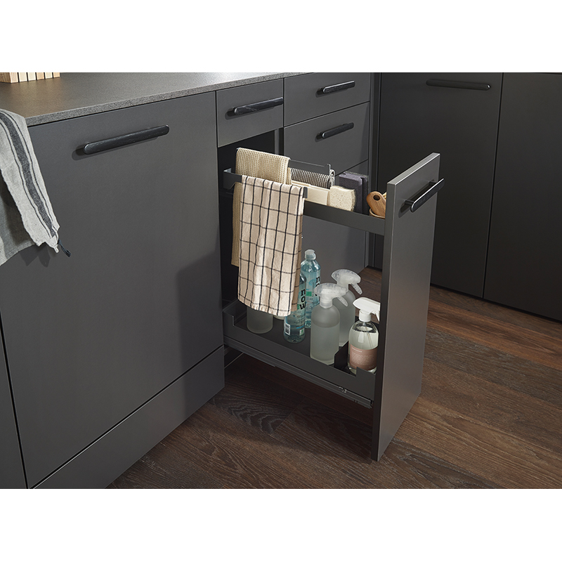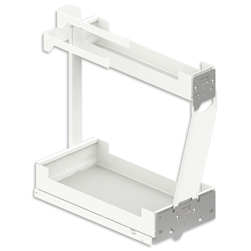 Tôle d'acier peinte par poudrage, coulisse à sortie totale, Softclose intégré, ouvrir l'extension frontale et accéder directement à la surface de rangement sur 2 - 4 étages, compatible avec les coulisses Grass Nova Pro, capacité de charge 0 - 30 kg, épaisseur de la paroi latérale 16 - 19 mm, sans rail de corps Nova Pro, sans jeu de rails, sans Push-to-open,