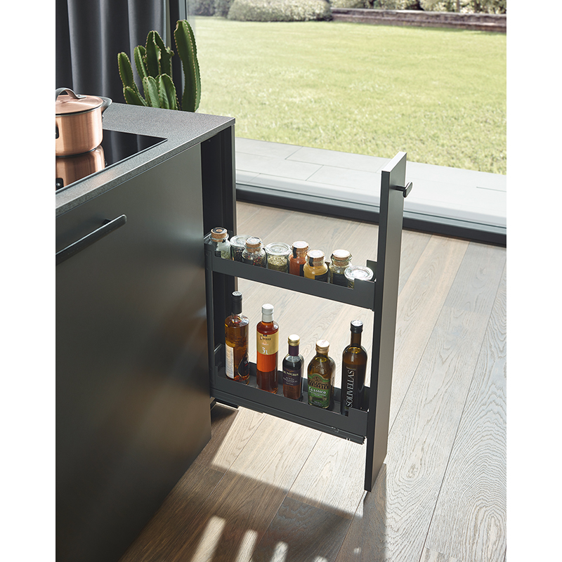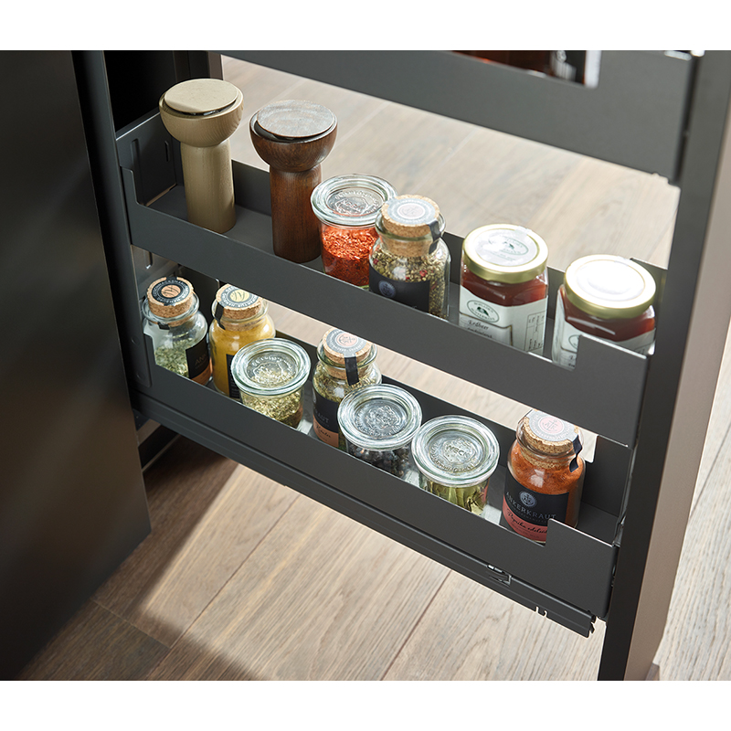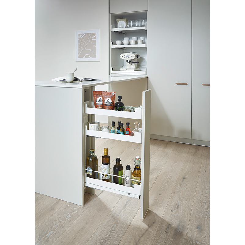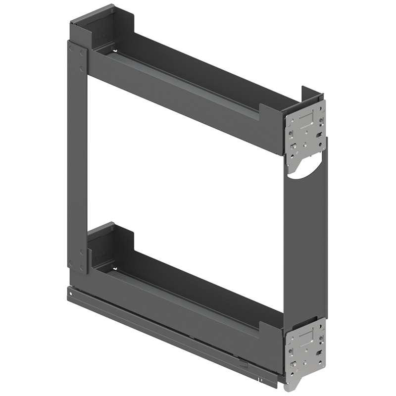 Tôle d'acier peinte par poudrage, coulisse à sortie totale, Softclose intégré, ouvrir l'extension frontale et accéder directement à la surface de rangement sur 2 - 4 étages, compatible avec les coulisses Grass Nova Pro, capacité de charge 0 - 30 kg, épaisseur de la paroi latérale 16 - 19 mm, sans rail de corps Nova Pro, sans jeu de rails, sans Push-to-open,