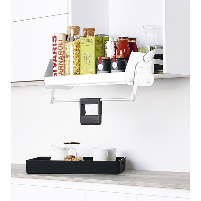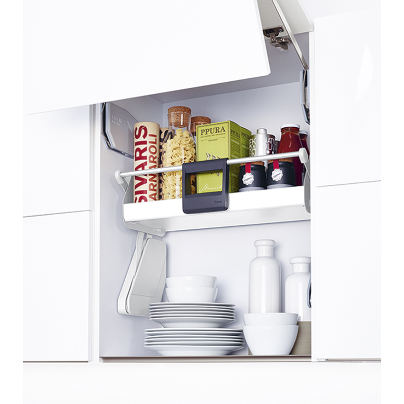 ferrure lift complète pour armoires suspendues, tous les objets situés dans les armoires suspendues en hauteur sont parfaitement accessibles, descente extrêmement légère à hauteur des yeux et à portée de main par le support à ressort, la tringle s'écarte par basculement lorsque le système est tiré vers le bas, blocage en position ouverte, avec Softclose, pas d'ajustement nécessaire, hauteur intérieure: min. 415 mm, profondeur intérieure: min. 270 mm, pour parois latérales de 16 et 19 mm d'épaisseur
