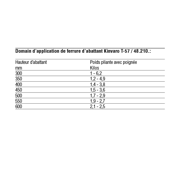 Acier, réglable en continu jusqu'à 240 N, avec 2 angles d'ouverture variables de 75° et 90° (à partir de 17° l'abattant se relève automatiquement), réglable en hauteur avec des trous oblongs,