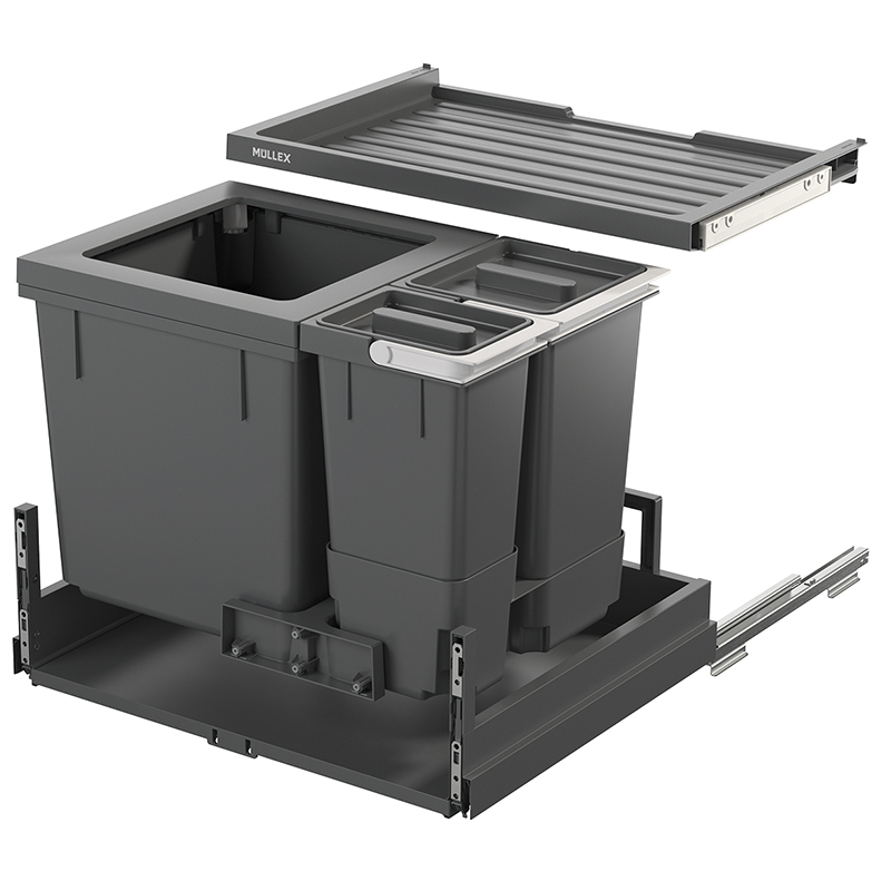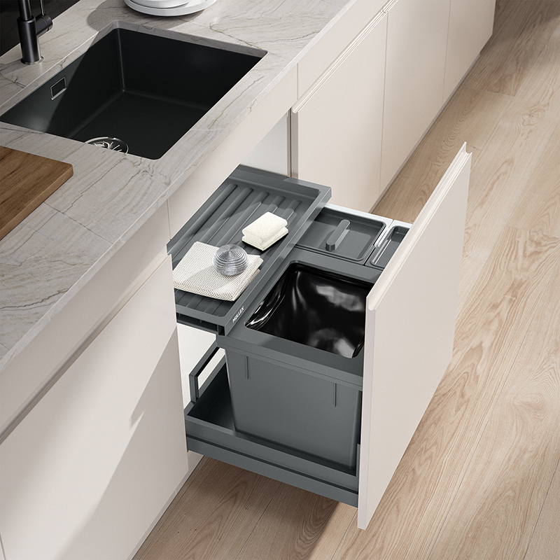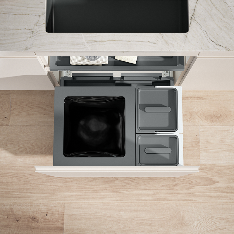 Cet ensemble complet pour une largeur de caisson de 600 mm a été conçu pour les ménages avec des caissons de cuisine plus bas, cependant, il n’est pas nécessaire de se passer d’une option intégrée pour séparer et stocker les marchandises, le récipient principal de 35 litres est idéal pour le sac poubelle, les deux récipients supplémentaires d’un volume de 8 et 5 litres offrent de l’espace pour collecter les déchets organiques ou stocker les pastilles pour le lave-vaisselle, par exemple, les récipients peuvent être positionnés au choix à gauche ou à droite du récipient principal, le tiroir Basic, qui offre un espace de rangement supplémentaire, est également inclus dans l’ensemble, le système est fourni avec le tiroir complet Pro robuste