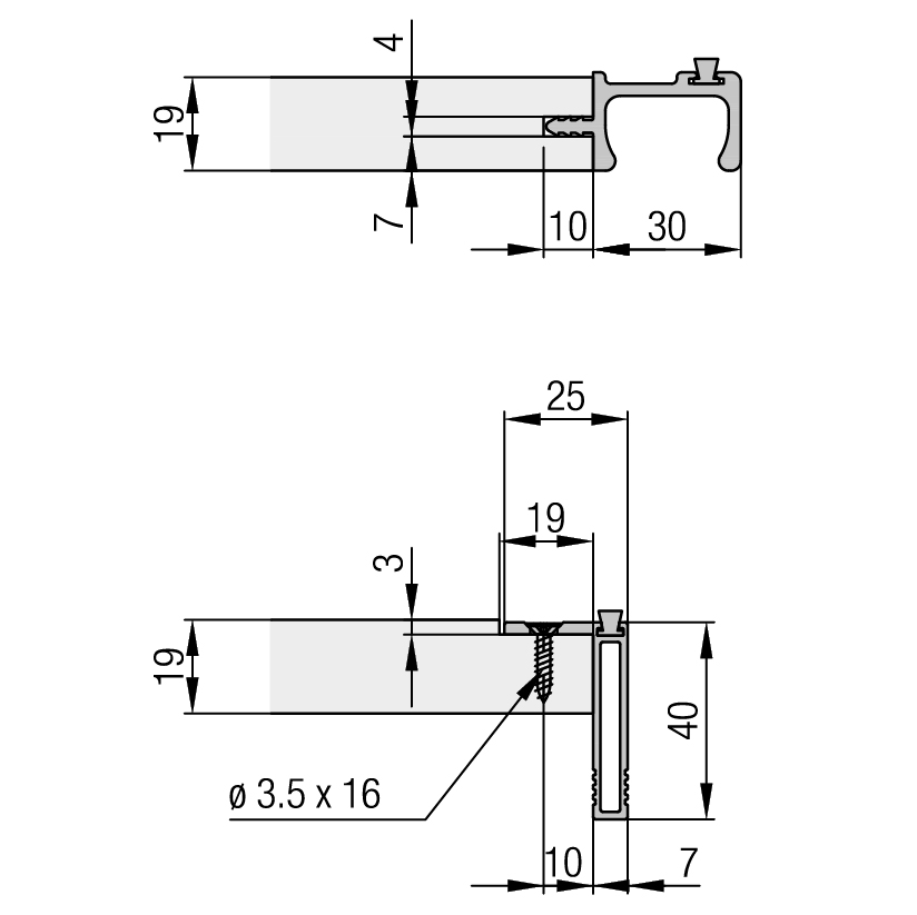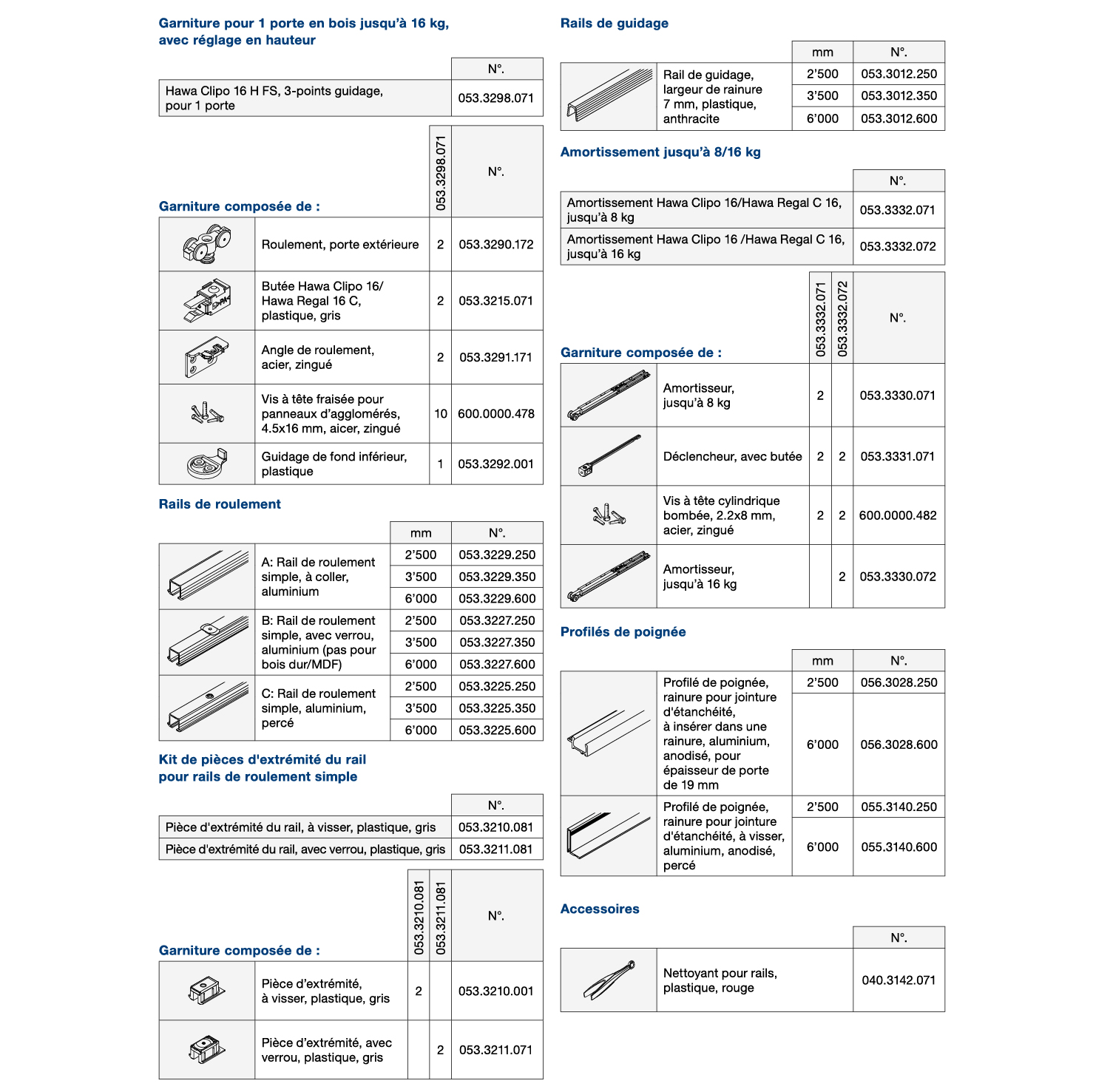 pour portes d'armoire coulissantes en bois jusqu'à 16 kg, entrant dans le corps en haut et le corps en bas, dimensions porte (largeur x hauteur) max. 1000 x 1400 mm, épaisseur de porte 16 - 25 mm, chariot à clipser, sans rails de roulement, sans accessoires